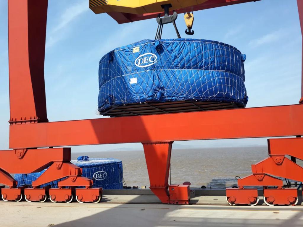 来利国际AG旗舰厅电气制造的巴西杰瑞水电站机组定子装船启运
