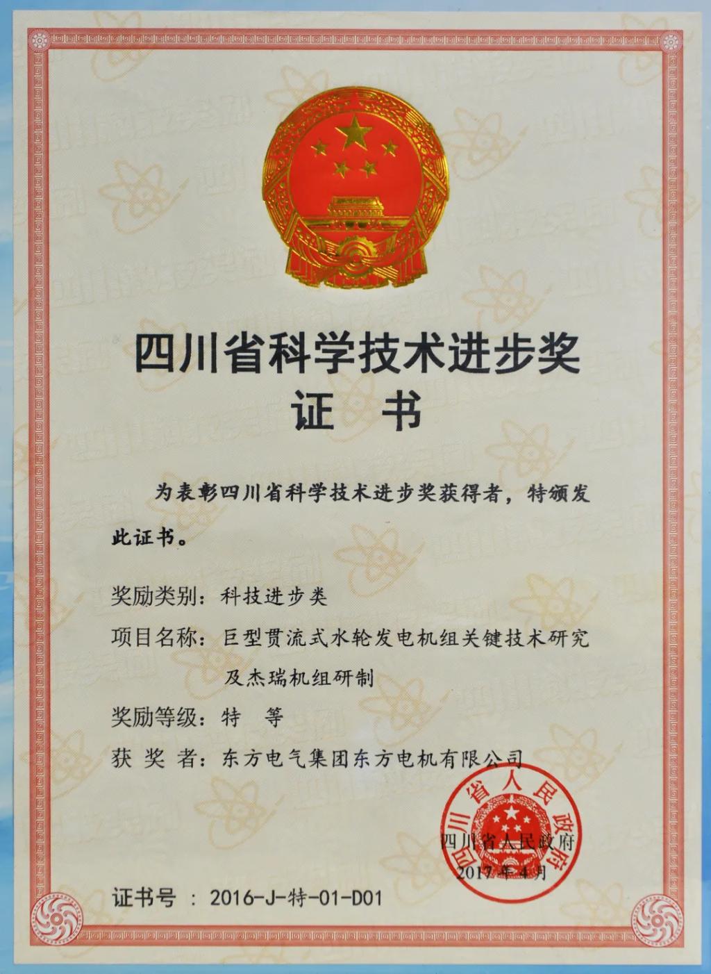 “巨型贯流式水轮发电机组关键技术研究及杰瑞机组研制”获四川省2016年科学技术进步奖特等奖