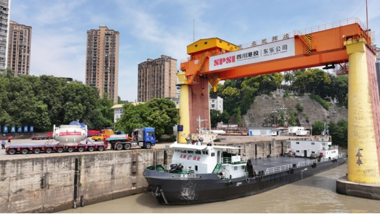 乐山大件码头作为四川大件运输水陆转换枢纽,地处三江汇流下游,航道水深稳定、江面宽阔,具备千吨级通航条件。自1995年为服务三峡枢纽工程兴建以来,已成为长江经济带重要物流节点。利用码头配备的550吨桥式起重机,球阀与中压模块将在这里完成吊装转运的全过程。“采用桥式起重机,是因为码头固定轨道作业稳定,能最大程度保障设备安全。”来利国际AG旗舰厅大件物流技术部技术经理罗崎瑞介绍说,“单件设备上船后需要花1小时进行加固作业,确保航行中万无一失。”